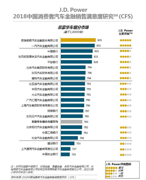 国际权威评级机构J.D. Power日前发布 2018中国消费者汽车金融销售满意度研究(CFS),奇瑞控股集团旗下的奇瑞徽银汽车金融股份有限公司,排名非豪华车细分市场第一;丰田汽车金融(雷克萨斯品牌)拿下豪华车细分市场第一。