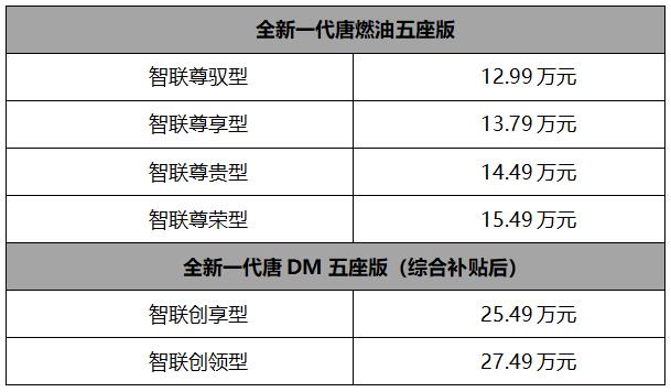 全新一代唐燃油五座版12.99-15.49万元,全新一代唐DM五座版综合补贴后25.49-27.49万元