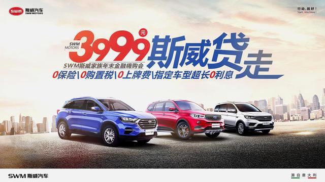 12月31日前,消费者前往斯威汽车各大城市4S店购车签单,最低只需要3999元首付款,就能够将一台斯威汽车贷回家!更重要的是,还能享受0保险!0购置税!0上牌费!部分车型甚至达到0利息的超级钜惠!