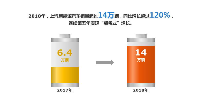 2018年,上汽新能源汽车销量超过14万辆,同比增长超过120%,连续第五年实现“翻番式”增长,已成功跻身市场销量三甲,正在向新能源汽车销量冠军发起冲锋。其中,自主品牌荣威和名爵新能源汽车销量达9.6万辆,同比翻番,插电强混荣威eRX5、ei6以及纯电动Ei5均已成为新能源市场的明星车型,树立起上汽新能源中高端的品牌形象。上汽大通燃料电池轻客FCV80已在全国3个城市实现商业运营,车队规模超过300台。