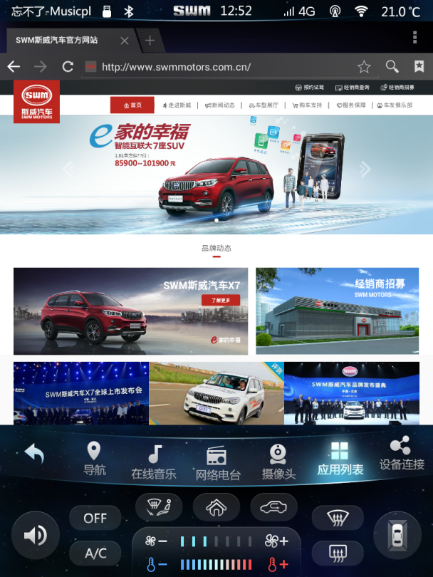 另外,斯威X7的手机远程控制系统还支持预约售后、查询违章、车辆救助、事故预警、年检提醒、行车日志分享等功能。同级罕见的12寸高清中控屏,海量在线影音娱乐资源随叫随到,无论是父母爱听的京剧、宝宝喜欢的儿童音乐都能一键直达,让欢声笑语一路随行。