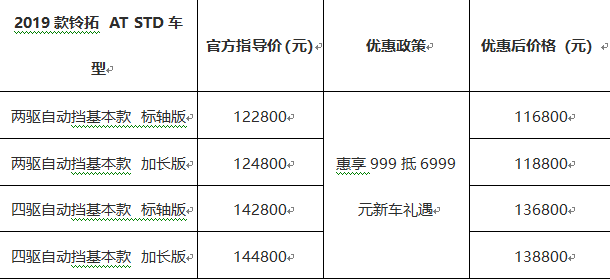 2019款铃拓AT车型问世后,引发了强烈的市场反响,客户订车积极,铃拓车型销量势头迅猛。为更大程度满足消费者的实际用车需求,江西五十铃快速做出响应,现重磅推出价格更低的铃拓AT STD车型,官方指导价为12.28—14.48万元。新车“惠享999抵6999元新车礼遇”,AT车型价格仅需11.68万元起!