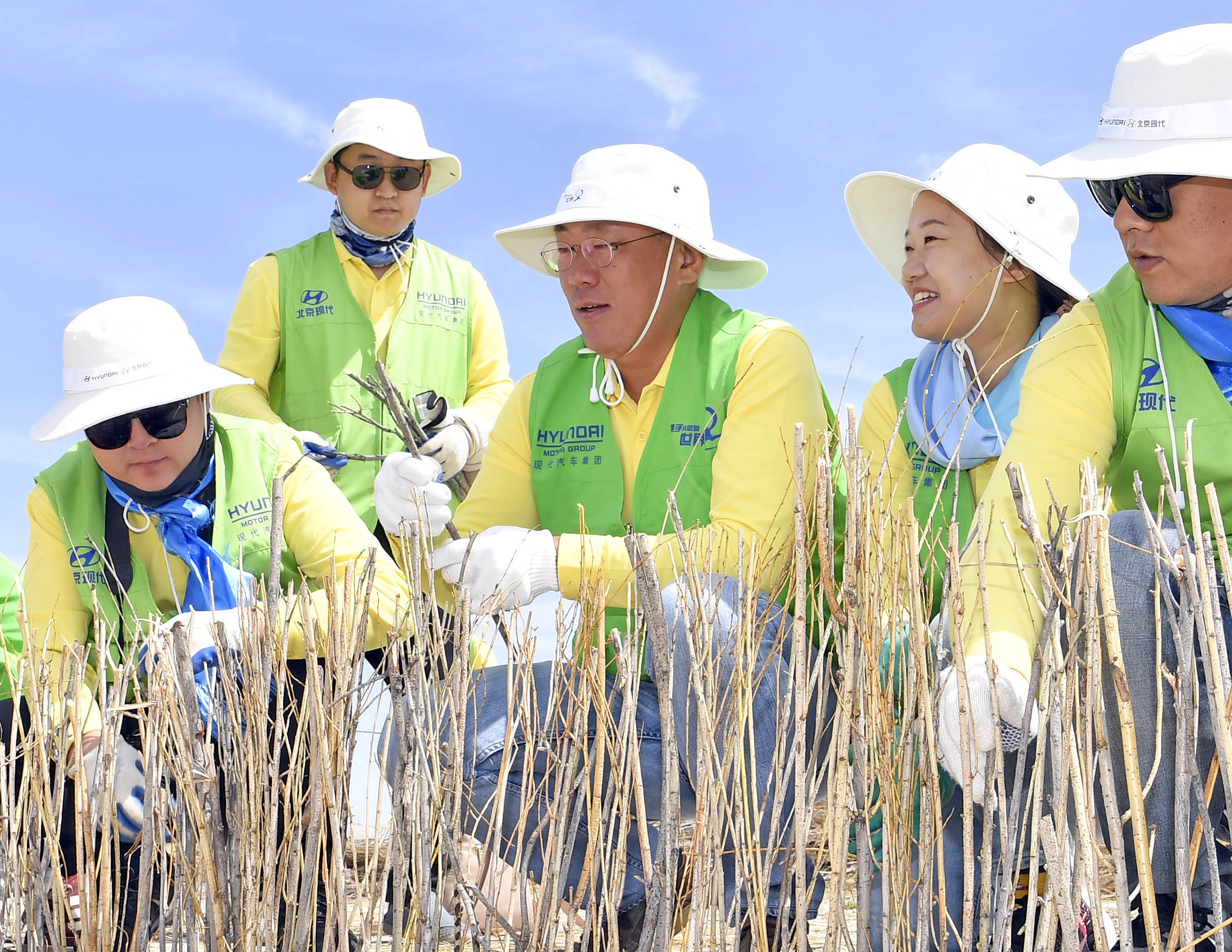 现代汽车集团首席副会长郑义宣与志愿者共同治沙