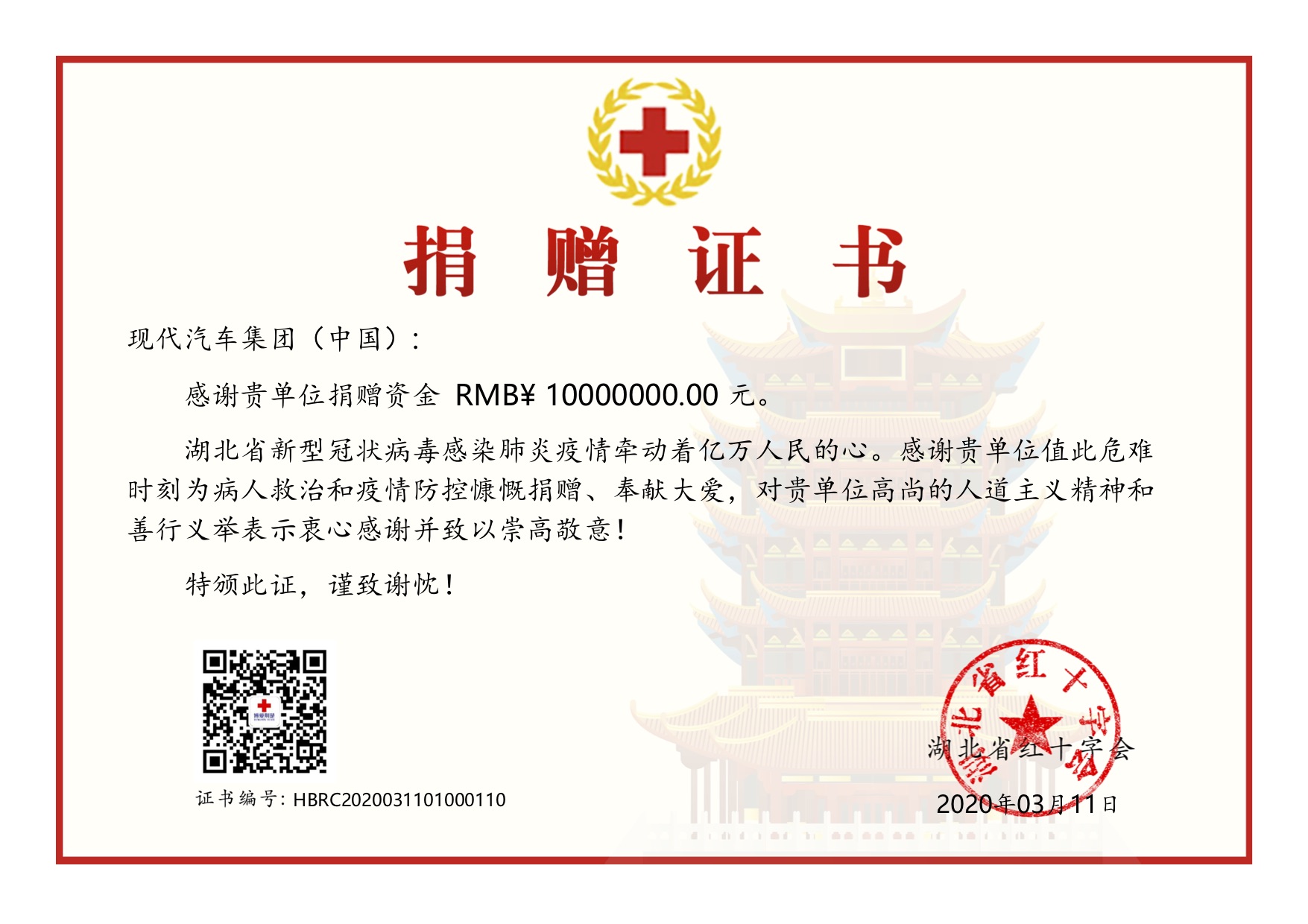 现代汽车集团捐赠证书
