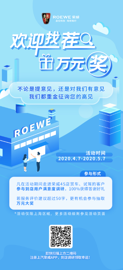 4月7日-5月7日,上汽荣威开展“欢迎找茬万元奖”用户满意度专项活动,鼓励用户对现有服务内容进行“找茬”,以了解更多用户需求,众筹广大用户灵感,全方位提升服务品质。为感谢用户支持,参与活动的用户人人有奖,更有机会赢得高达万元的幸运大奖!