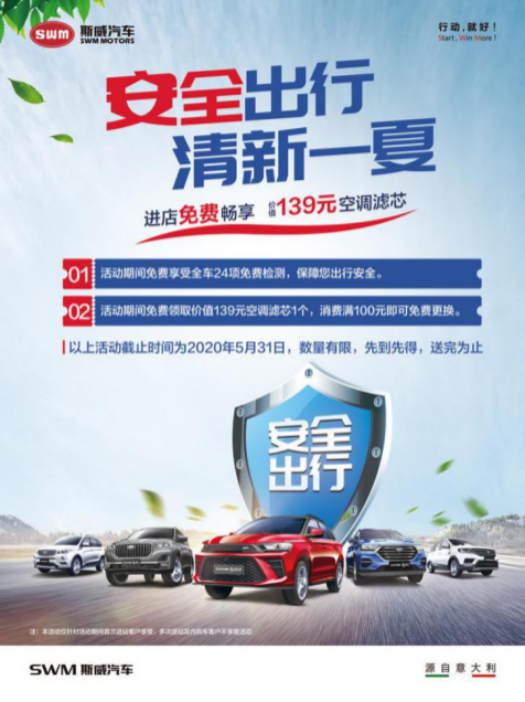 对于广大斯威新老车主,此时也将再获厂家送出的惊喜福利:5月31日前,驱车前往斯威各地服务站,均可享受全车24项免费检测;同时,车主到站还可免费领取价值139元空调滤芯1个,消费百元即可免费更换。畅享清新安全的出行新体验,车主福利先到先得!