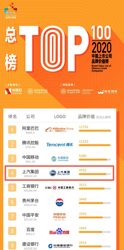 (5月11日,上海)在昨日正式发布的“2020中国上市公司品牌价值榜”上,上汽集团品牌价值高达4753亿元,从数千家参评公司中“突出重围”,名列总榜TOP100第4名。同时,上汽集团海外品牌价值达到196亿元,在海外榜TOP50排名第16位。