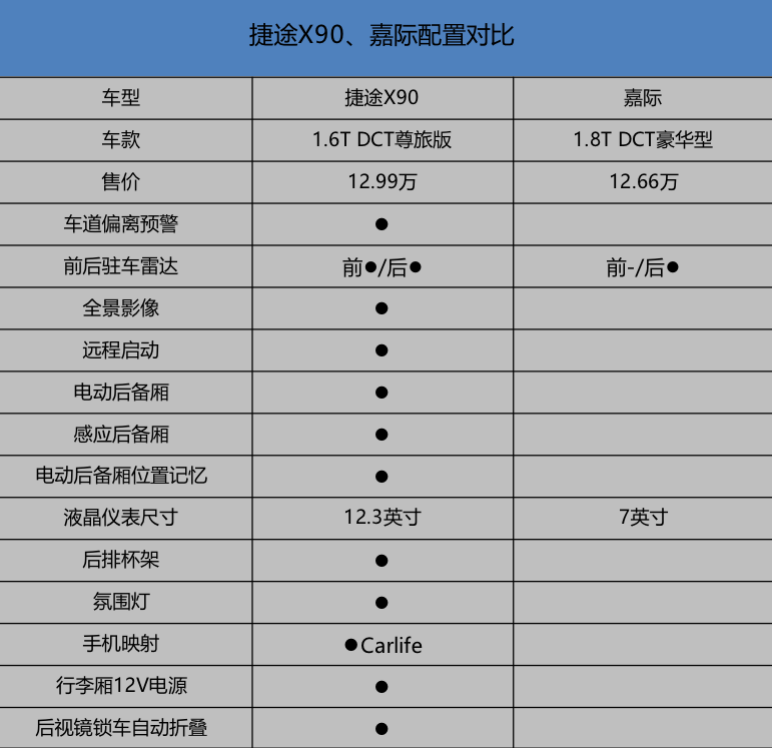 新款吉利嘉际公布的售价为9.48-15.98万,将近10万元的起步售价并不低,相比之下捷途X90 7.99万的起售价看上去要诚意很多,那两款车谁的性价比更高呢,我们不妨稍作对比。我们选取捷途X90售价12.99万的1.6T DCT尊旅版和嘉际售价12.66万的1.8T DCT豪华型做对比,两款车售价差距不大,且配置水平较为丰富,具有代表性,也都是比较热门的车型。