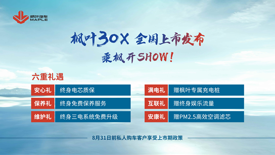 上市期间,枫叶汽车推出了购车即享6重好礼的限时优惠政策,包括终身电芯质保、终身免费保养服务、终身三电系统免费升级;随车赠枫叶专属充电桩、赠终身娱乐流量、赠PM2.5高效空调滤芯等。用看得到的福利,把实惠传递给每一个用户,让每一个人都能开得起高品质的新能源汽车。