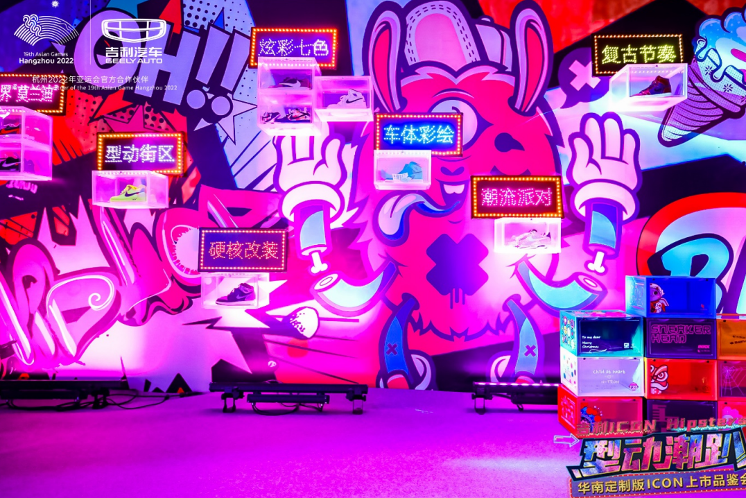 过千平方米的活动场地,以不同的侧重点的四个区域,展示 ICON 所代表的潮流文化与年轻时尚。潮流 ICON 以视觉体验,以立体涂鸦展示以及 AJ 鞋展示墙突出当下的流行趋势; 文化 ICON 则以白话方言的涂鸦墙,突出华南地区特色本土文化;科技区域展示了改装工具以及充满未来感的 ICON 整车;而定制 ICON 区域,即展出了本次上市品鉴会的两款主角车型——ICON BOY 男生版以及 ICON GIRL 女生版。