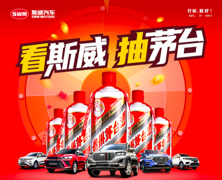作为汽车营销界的“宠粉好手”,斯威汽车近日推出了“看斯威,抽茅台”的宠粉活动。10月15日-11月30日,斯威汽车联动国酒茅台解锁宠粉“组团”新玩法,这次不用“剁手”,只需“抽抽抽”即可,且没有参与人群限制,仅需动动手指,就有机会让粉丝将茅台酒带回家。