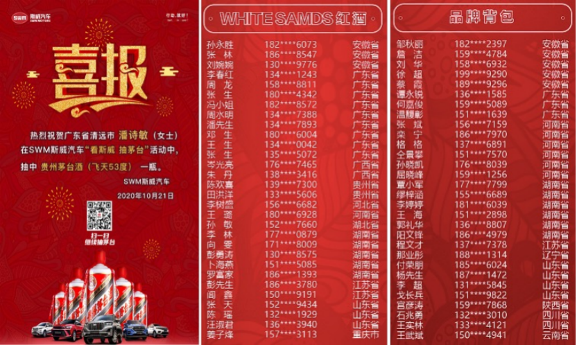 此次活动,斯威汽车也是大手笔,奖品不仅包含价值珍贵的“53度贵州茅台酒飞天”,奖品数量更是多达50名,还包括WHITE SANDS红酒200名及时尚背包300名,多重多量福利实力回馈粉丝。