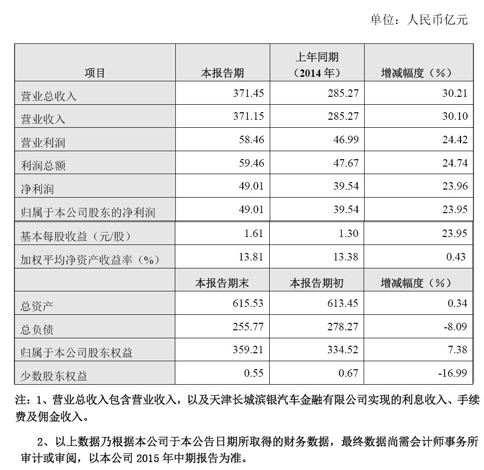 7月27日,长城汽车发布2015年上半年业绩快报:1—6月长城汽车实现净利润49.01亿元,同比增长23.96%;营业总收入371.45亿元,同比增长30.21%;利润总额59.46亿元,同比增长24.74%;基本每股收益1.61元,截止6月底资产总计达615.53亿元。