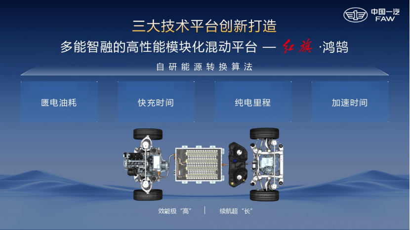 二是升级“红旗·鸿鹄”混动平台,拓展增程技术路线,革新混动专用发动机、三电机、四电机等关键总成,为用户带来低能耗、长续航、快充电、高安全的跃升体验。