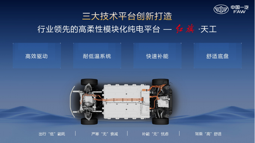 一是进化“红旗·天工”纯电平台,全面升级同轴电驱、宽温域电池、智慧热管理、主动悬架等核心系统,覆盖更多极限场景,实现更好极限驾控,为用户带来更超值、高安全、低能耗、高品质、超快充的进阶体验。