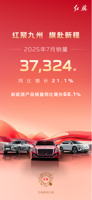 红聚九州,旗赴新程。2025年8月1日,红旗品牌发布最新销量成绩:7月份,红旗品牌单月销量突破3.73万辆,同比增长21.1%,与此同时,红旗品牌也正式成为首个达成200万用户积累的中国豪华汽车品牌。其中,红旗新能源产品销量同比增长66.1%,彰显智电产品扩容成效。红旗燃油车产品销量同比增长5.1%,稳守高端市场基本盘。红旗金葵花产品销量再破百台,持续赋能超豪华市场,打造极具东方神韵的顶级豪华体验。