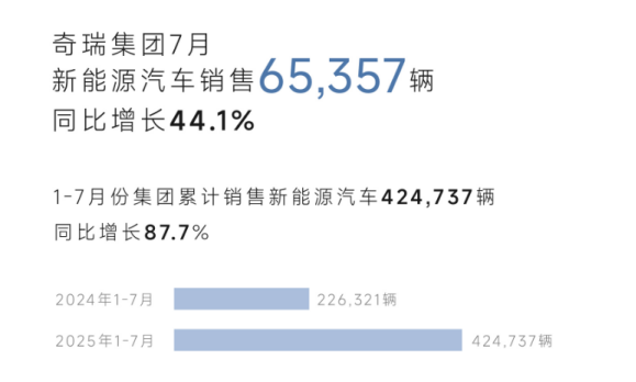 增速位居行业前列!奇瑞集团7月销售新能源汽车6.54万辆,1-7月累销新能源汽车42.47万辆