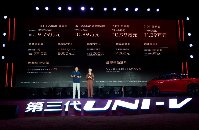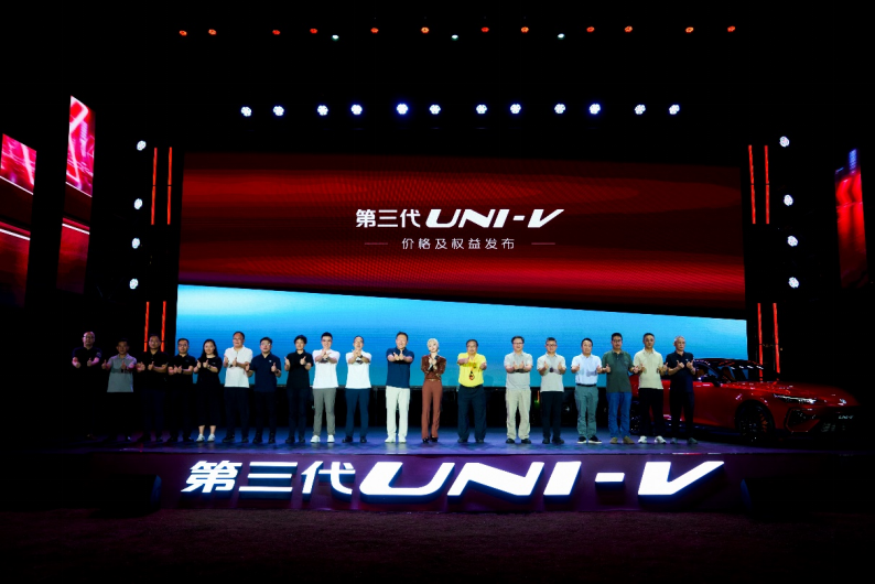 8月7日,长安汽车第三代UNI-V价格及权益发布会在重庆钻石广场盛大举行。现场,在UNI-V用户的共同见证下,长安汽车执行副总裁叶沛与第三代UNI-V“超感玩家”周笔畅,共同揭晓了第三代UNI-V价格及权益。新车定位“超感智能运动轿跑”,此次共推出4款配置车型,官方指导价10.29万元——11.99万元。