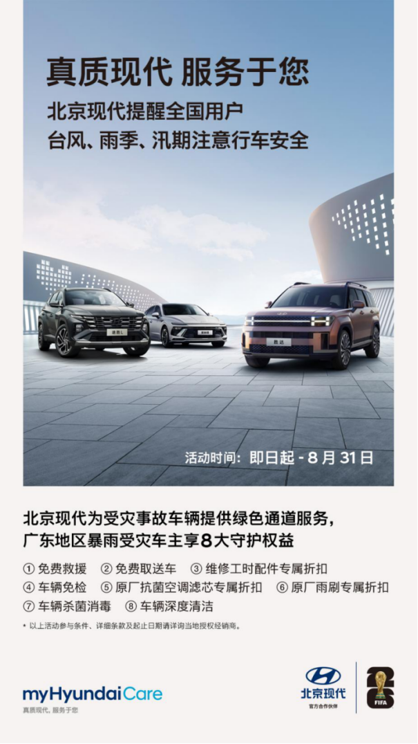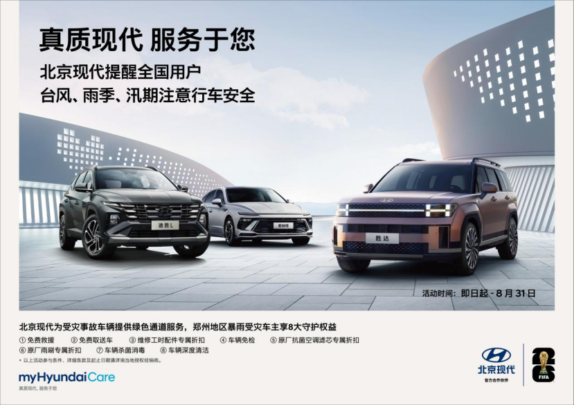 此外,北京现代提醒全国用户,在台风、雨季、汛期期间要注意行车安全。同时,在保障自身安全的情况下,对临近需要帮助的车主朋友提供支援,希望大家在困难面前团结互助,共克时艰。