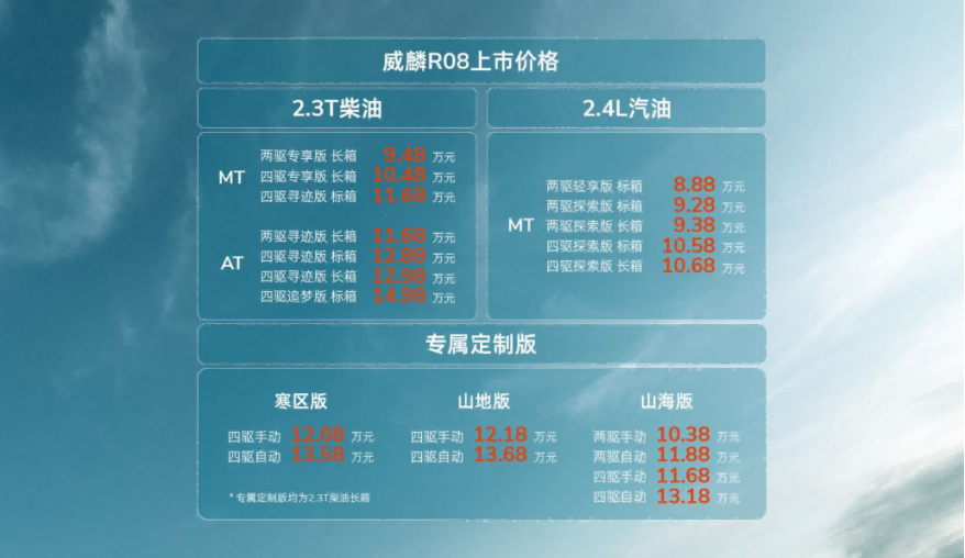 威麟R08深知,不同地域的用户面对的路况与挑战各不相同,因此特别打造了专属定制版车型。无论是高寒的东北、西北,还是崎岖的西南山区,抑或是潮湿多盐的沿海滩涂,都为用户提供最贴心的解决方案。