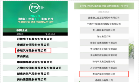 奇瑞入选《财富》“中国ESG影响力榜”、福布斯中国“可持续发展工业企业”