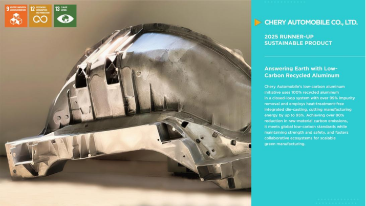 近日,奇瑞汽车在2025年度Altair Enlighten Award全球颁奖典礼上凭借“Answering Earth with Low-Carbon Recycled Aluminum”项目,荣获“可持续产品类”全球亚军。作为全球首个凭借“再生低碳铝合金技术”获此殊荣的整车企业,标志着中国汽车工业在轻量化与低碳转型领域正式跻身全球第一阵营。