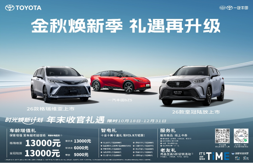 不止如此,为回馈用户厚爱,一汽丰田金秋焕新季,礼遇再升级。10月18日至12月31日,皇冠陆放、格瑞维亚、普拉多等重磅车型不仅可享至高1.3万元的车龄增值礼;同时还有智电礼、服务礼和用品至高5折的好友礼等多重大礼,以极致诚意为用户创造最佳购车时机。