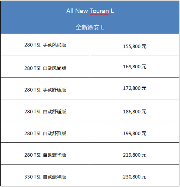 2016年3月18日,上汽大众全新途安L于长沙焕新上市。这款面向摩登家庭的高级家庭用车,提供280TSI及330TSI两款动力选择,结合不同配置,推出风尚版、舒适版、舒雅版及豪华版共计7款车型,售价区间为15.58万元—23.08万元。
