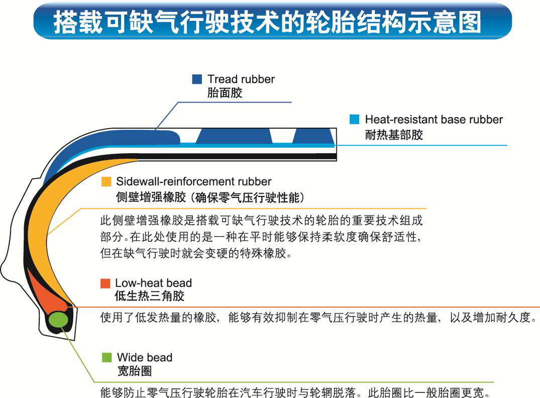 普利司通搭载可缺气行驶技术的轮胎是指零胎压下仍能继续以一定的速度安全行驶一定距离的轮胎。凭借即使发生爆胎也能保障行车安全、并且实现车辆无备胎化的安全环保性能而被世人所熟知,目前已成为海外众多高端车型的标准配套轮胎。在全球温室化的背景下,控制行业的高排放量已经成为了重要的课题之一。同时兼顾了便利性、安全性和环保性能的RFT可缺气行驶轮胎,无需搭载备胎的重量也能安全地行驶,为减少废弃轮胎数量而做出了贡献。