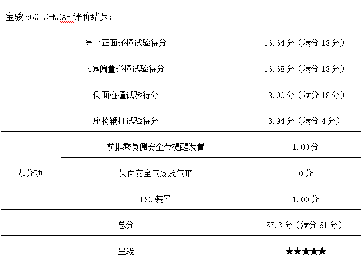 上汽通用五菱宝骏560在7月1日中国汽车技术研究中心公布的新一期的C-NCAP碰撞试验结果中凭借57.3分获得五星评级,证明了其过硬的防碰撞本领。