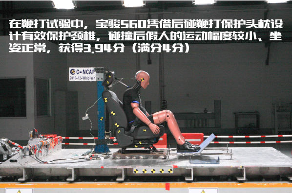 在鞭打试验中,宝骏560凭借后碰鞭打保护头枕设计有效保护颈椎,碰撞后假人的运动幅度较小、坐姿正常,获得3.94分(满分4分),再加上丰富安全配置的加分,宝骏560最终斩获57.3分的好成绩。