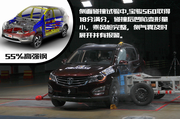 在可变形移动壁障侧面碰撞试验中,宝骏560能够取得18分满分的成绩,得益于其整车大量使用抗拉强度超过1200Mpa的超高强钢材,并且在B柱、车门防撞梁等位置使用世界一流的热成型技术,使得碰撞凹陷变形量小,乘员舱保持了良好的完整性,侧气囊及时展开并有报警。