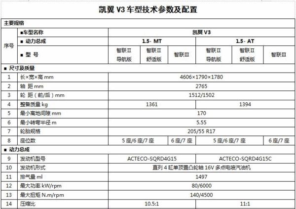 鹰眼式前脸、鹰眼式光导大灯配合鹰隼式腰线,沿袭了凯翼鹰式家族化DNA,展现了流体雕塑灵动造型。在全新的设计下该车整体造型更加修长,适合多功能用车审美需求。内饰方面采用全黑/黑棕双色内饰,既有运动感又有品质体现。炫彩4.2寸TFT仪表屏搭配10.1寸CarPad触屏则极具科技动感。双安全气囊、无钥匙进入、一键启动、日间行车灯、真皮多功能方向盘、皮质座椅、前排和中排的3个USB可充电接口、后排隐私车窗等中高档车才有的豪华配置也出现在凯翼V3上,同时该车还全系标配ABS+EBD。动力方面,凯翼V3搭载全国十佳ACTECO发动机,手动和自动挡百公里油耗分别为6.7升和7.1升,在兼顾动力的同时还拥有不俗的油耗表现,完全可以满足消费者的日常用车。