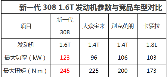 新一代308提供了三种发动机选择,1.6THP涡轮增压直喷发动机、1.2 THP涡轮增压直喷发动机以及新一代1.6L CVVT技术发动机。通过数据对比可以看出来,新一代308的1.6T发动机在细分市场中占据绝对领先地位,而1.2T发动机同样处于细分市场中上等水平,1.6L发动机参数则处于市场同类型发动机主流水平。新一代308优秀的动力性能是其核心卖点之一。