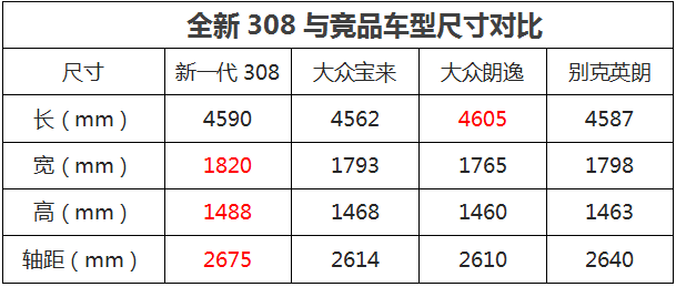 新一代308的车身尺寸长宽高分别为4590/1820/1488mm,轴距达到2675mm。通过对比可以看出来,新一代308的车身尺寸在同级别中拥有绝对领先的水平,特别是轴距明显超越宝来、朗逸、英朗等市场热门的同级车型。