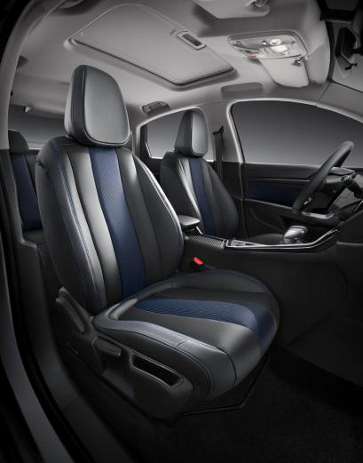 新一代308的方向盘采用了高品质真皮包裹,蓝色精致缝线,不仅具有良好手感,更提升了座舱内档次。新一代308还采用了碳纤维双纹理仪表台,仪表板上采用碳纤维纹理的TPO真空吸附装饰件,提升用户的感官体验;TPO材质带有珠光效果,增加视觉冲击,提高内饰档次。另外,整体软质搪塑包裹,车身双缝线工艺更添品质感和高级感。