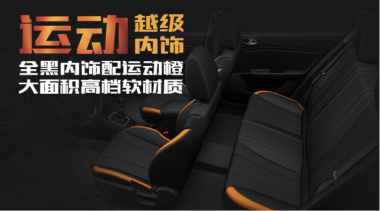 从中控台往后方看去,宝骏310内部车身配色十分惊艳。比时下“讨好”年轻人的主流红色更超前一步,宝骏310大胆启用了“黑+橙”搭配,亮度和饱和度更好的橙色在全黑内饰衬托下,更加运动也更加青春逼人。运动感十足的同时,宝骏310兼顾了舒适与实用感受,前后门的双重软触材质和座椅的高档材质,让乘坐既舒服又有品质感。