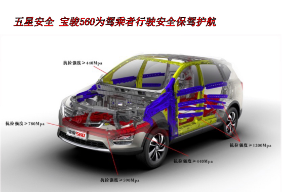 出色的成绩,源于最初的信念。宝骏560 采用3H 高钢车身,高强钢占比超过55%,大量使用抗拉强度超过1200Mpa 的超高强钢材,配合世界领先的热成型冲压工艺和激光拼焊工艺,最大程度的为驾乘者支撑起安全座舱控件。配置上则应用了4 安全气囊、前排预紧式安全带、ESC 车身电子稳定系统、倒车影像、VDC 车辆动态控制系统、TCS 牵引力控制功能、HBA 刹车辅助功能等,全面保障用户安全出行。