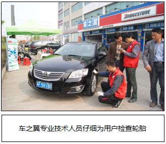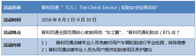“TCS轮胎安全检测活动”是普利司通依托旗下“车之翼”、“普利司通轮胎店(BTS店)”等核心家族网络店铺,由普利司通店铺专业人员免费对用户车辆轮胎胎压、花纹深度、外伤老化等进行专业检测,排除轮胎安全隐患,让广大车主全面了解轮胎知识的公益之举。普利司通店铺的专业人员还将为用户提供轮胎使用及养护建议,呼吁大家进一步增强轮胎安全意识,逐步养成正确的轮胎使用习惯,以此减少因轮胎受损带来的交通事故、意外伤害。自2003年以来,普利司通已连续13年在全国500多座城市面向中国广大汽车用户开展了“TCS轮胎安全检测活动”。