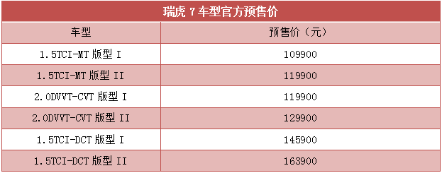 奇瑞全新一代紧凑级SUV瑞虎7于8月5日正式发布预售,预售价格区间109900——163900元,并提供2.0L自然吸气和1.5T涡轮增压直喷发动机可选,传动匹配MT、CVT以及DCT双离合变速箱,共6款车型现已同步开启预售。