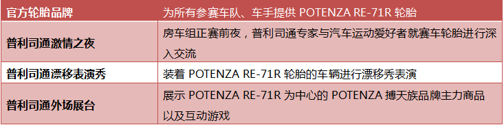 作为全年独家轮胎供应商,普利司通为所有参赛车队、车手(共10个车队38名车手)带来了今年上半年重磅推出的全新赛道专用轮胎POTENZA RE-71R。