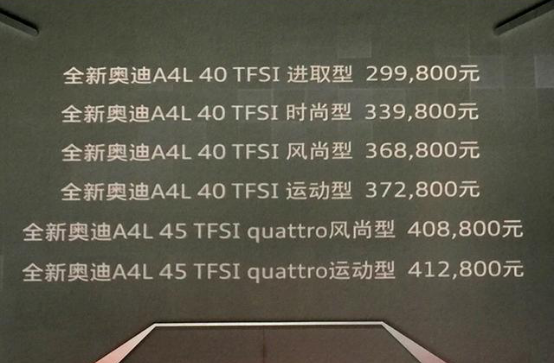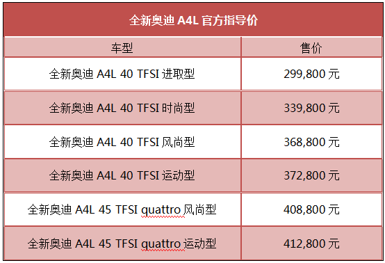 2016年9月10日,全新奥迪A4L在上海东方体育中心换新上市,新车推出2.0 TFSI高低功率两个版本共计6款车型,售价区间为29.98万元—41.28万元。全新奥迪A4L基于大众集团目前最高级的MLB Evo平台打造,采用全新的家族化设计,以全面领先的实力和由内而外的心意,掀起新一轮的市场标准变革。