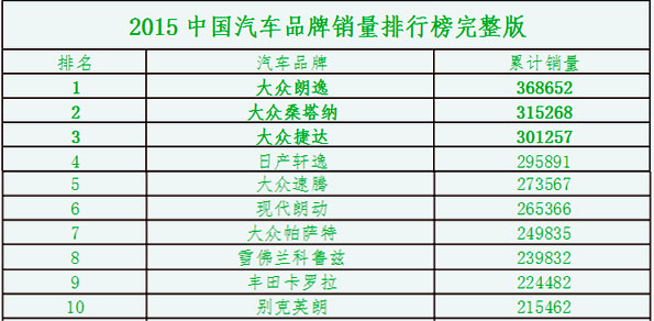 2015年轿车销量前十榜