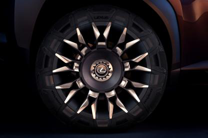 独特的轮胎造型使不同材料之间的界限变得模糊。UX概念车的轮胎采用高科技激光雕刻工艺,一方面强调运动性的胎纹增加了轮胎的接地面积,大幅提升了抓地性能;另一方面,胎壁的纹路从视觉上带来一种轮辐延伸到轮胎之中的感觉。这种融合式设计,使得轮毂和轮胎具有极高的整体性,不再像是分割的两个部分。