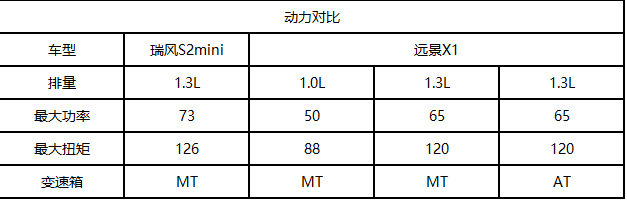 动力方面,远景X1提供了1.0L-5MT、1.3L-5MT和1.3L-4AT共3种动力组合,并预置地、运动、手动、经济四种驾驶模式。而瑞风S2mini相较X1有一些不尽如人意,就是其仅有一款1.3L自然吸气和5AT变速箱选择,选择相对少,而且现在很多年轻人已经不愿意开手动挡了。
