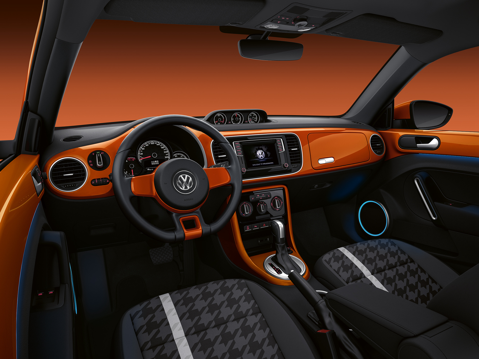 橙色不止是90后青春一代的外在表现,还是其内心的真实写照,因此在甲壳虫乐动橙版的内饰之中,橙色之魅亦如此动人。包括中控台、挡把鞍座、真皮包裹方向盘、门边饰板在内的众多部位,均有鲜橙活力的点缀,此外还有专属的运动组合仪表盘与三色氛围灯,进一步描绘甲壳虫乐动橙版用户群体的乐天心态。