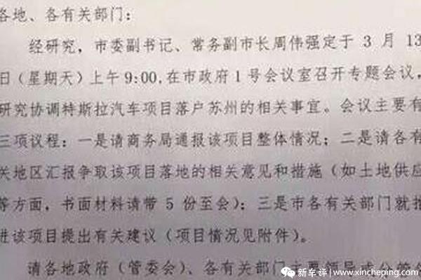 这份“文件”显示:苏州委副书记、常务副市长周伟强定于3月13日(星期天)上午9:00在市政府1号会议室召开专题会议,研究协调特斯拉汽车项目落户苏州的相关事宜。而特斯拉高层也将赴苏进行实地考察。根据规划,特斯拉首款国产车型将是MODEL 3,预计国产售价在30万左右。