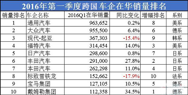 根据各大汽车制造商发布的数据整理出的2016年第一季度中国市场十大跨国车企销量排名显示。通用汽车击败大众成为冠军,福特压倒所有日系车企,十家集团中只有现代-起亚和标致雪铁龙同比下滑。