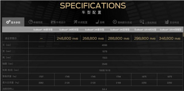 动力方面,新车搭载的是一台1.5L EcoBoost涡轮增压直喷发动机,其最大输出功率181马力,峰值扭矩240牛·米,与其搭配的是一部6速手自一体变速箱。新车的官方0-100km/h加速时间为10.6秒,作为参考,搭载2.0T发动机的EcoBoost 245车型的官方0-100km/h加速时间为7.9秒。结合现款入门级车型24.88万元的指导价,预计新车的价格有望进一步下探。