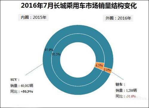 根据乘联会发布的销量数据整理可知,今年7月份,长城汽车(不含皮卡,下同)总计销售61,288辆新车,与去年同期41,810 辆相比,增长了46.6%。其中SUV作为长城汽车的主打产品,在长城乘用车总销量中占据了97.9%的比重,同比攀升2.4个百分点,销量较去年同期上涨50.3%至60,002辆。相比之下轿车销量较为惨淡,7月份销量仅实现1,286辆,同比暴跌31.6%。